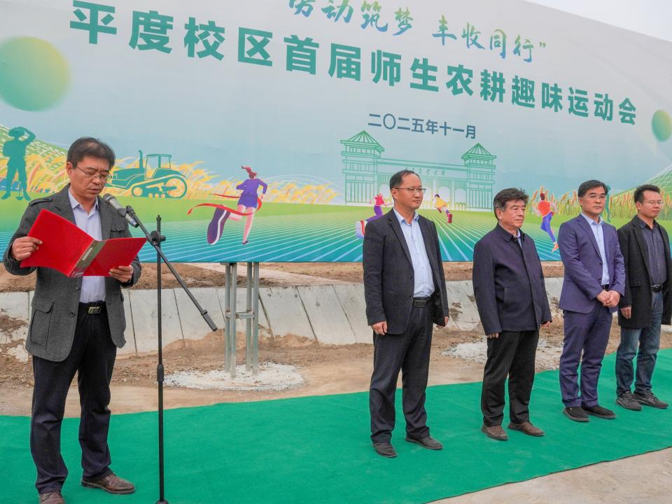 11月15日,“劳动筑梦 丰收同行”首届师生农耕趣味运动会在平度校区“秾华耕苑”教学实践与劳动教育基地举行。校党委副书记、平度校区党委书记田义轲,学生工作处处长杨凯出席本次活动。活动由平度校区管理办公室主任王国辉主持。